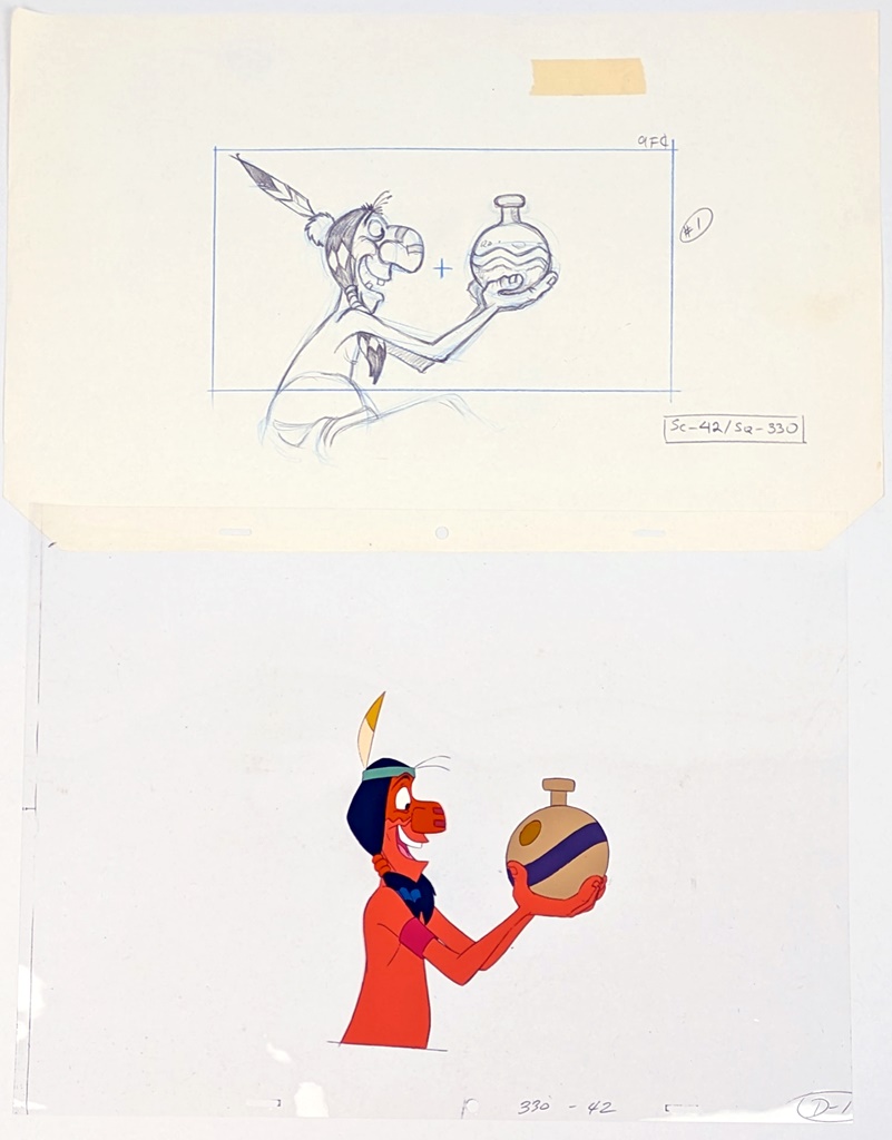 A production cel featuring a Native American and a preliminary sketch; total size of the foil: approx. 40 cm x 30 cm. Size of the image: approx. 17.5 cm x 14 cm.