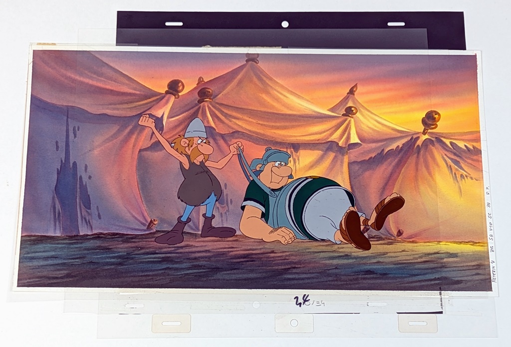 A production cel featuring a Gaul and a legionnaire with a hand-painted background; background size: approx. 40.5 cm x 23 cm; motif size: 24 cm x 12 cm.
